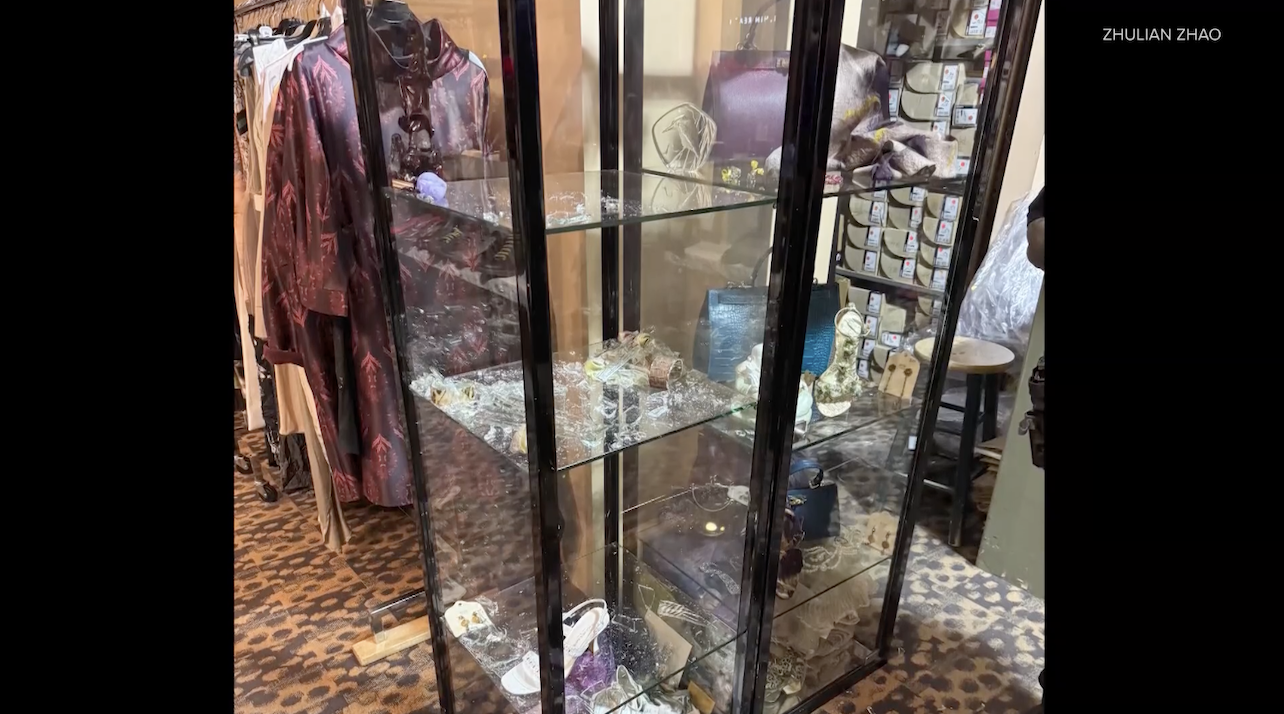 2026年1月2日凌晨,同样的手法再次出现。又一块石头砸向店铺正门,整扇前门被强行破开。等Zhao女士再次赶到时,店内已有多件商品不翼而飞,包括四只包、两条围巾以及多件珠宝饰品。