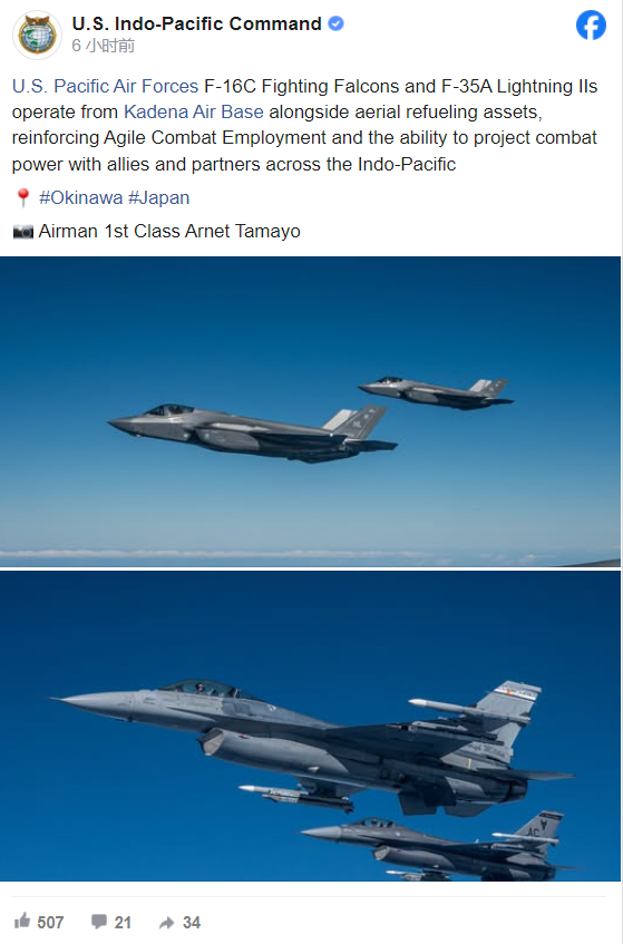 美国印太司令部今晚在官方脸书粉专释出多用途超音速战斗机F-16C「战隼」(Fighting Falcon)和目前全球最先进多用途匿踪战斗机F-35A 「闪电II」(Lightning II)的演训照片,「美国太平洋空军的F-16C与 F-35A,搭配空中加油支援力量,自嘉手纳空军基地出动,强化『敏捷作战部署』(Agile Combat Employment,ACE)能力,提升与盟友、伙伴在整个印太地区投射作战战力的能力。」