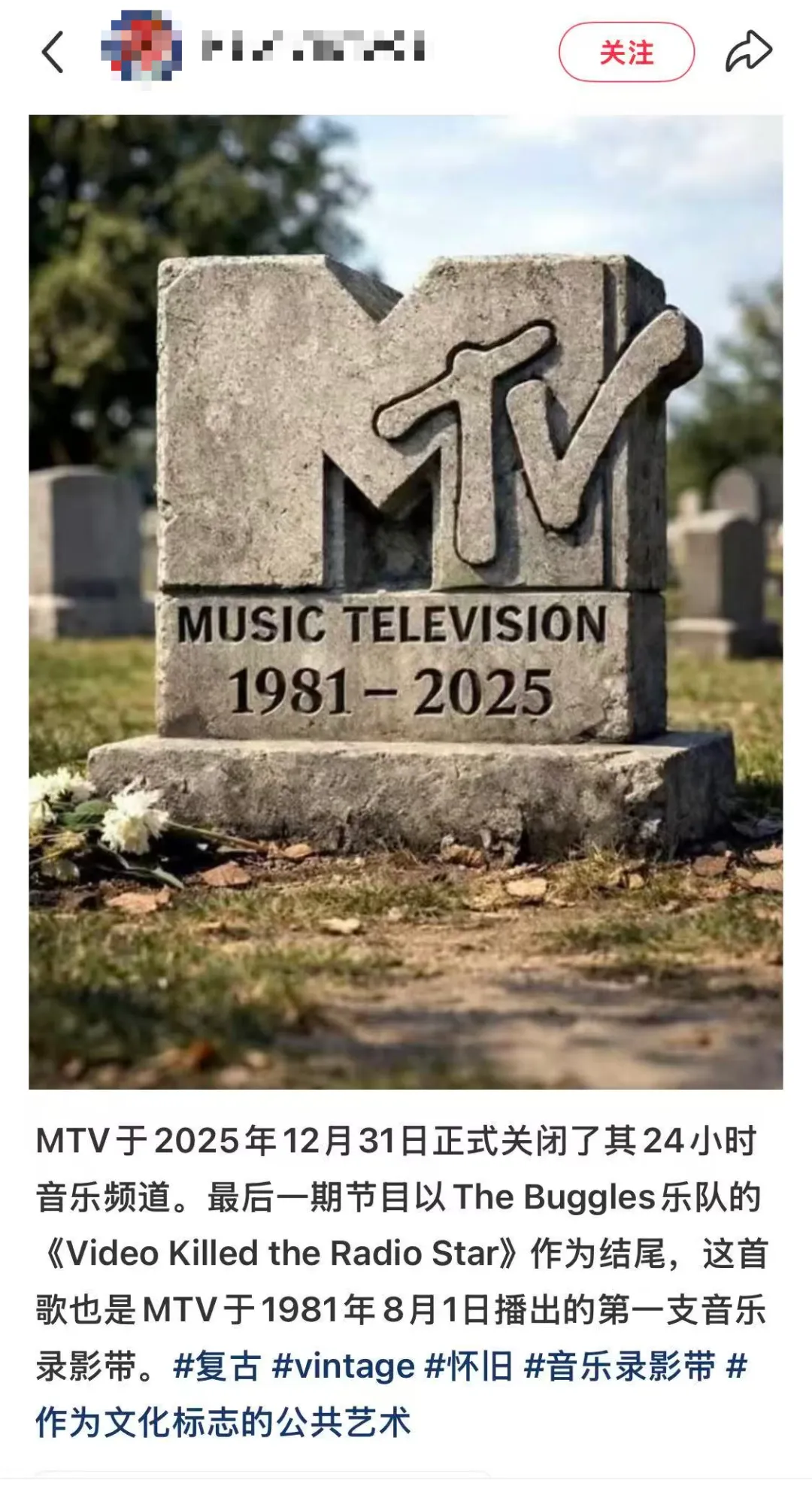 跨入2026年,MTV旗下现存的24小时音乐频道迎来全球停播,这意味着世界绝大多数国家和地区的观众已无法通过电视收看MTV的多个调频,包括曾被视为“全球文化现象”的MTV Music。