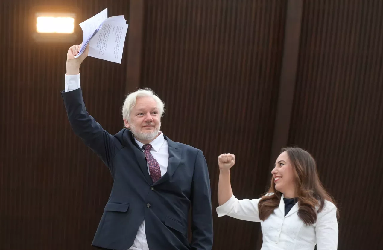 阿桑奇(左)获释后,与妻子史黛拉现身。美联社资料照片