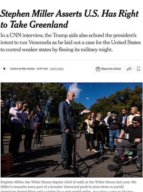 斯蒂芬·米勒——特朗普总统的高级顾问——周一声称,格陵兰理应属于美国,而且如果特朗普政府愿意,完全可以夺取这一丹麦的半自治领土。