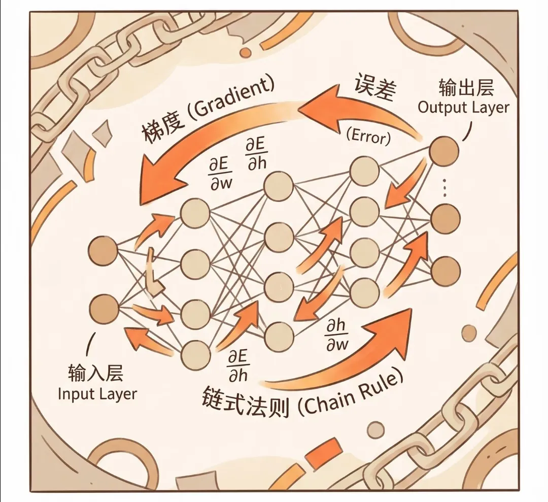 这就像工厂的质量追溯体系:当最终产品出现缺陷时,无需拆解整个生产流程,只需从成品出发,沿着生产线反向排查,每个工序只需确认自己环节的问题,就能快速定位到故障源头。反向传播算法正是这样一套为神经网络量身定制的“质量追溯系统”,让每个参数的“责任”都变得清晰可量化。