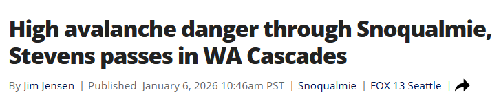 据雪崩监测机构Avalanche.org发布的信息,贝克山-斯诺夸尔米国家森林(Mount Baker-Snoqualmie National Forest)及北喀斯喀特国家公园(North Cascades National Park)区域的雪崩风险等级为“高”。在更东侧的温思罗普(Winthrop)和莱文沃斯(Leavenworth)附近地区,雪崩风险也达到了“相当”水平。