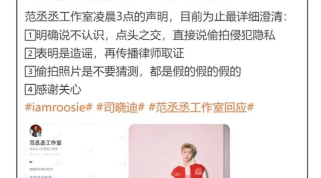 战火迅速蔓延。范丞丞被卷入,司晓迪放出他疑似在商K和打台球的远景照片,说他只是爱玩。 话锋一转,她又说范丞丞是她青春期唯一喜欢的男孩,两人相爱数年。 范丞丞工作室的声明很干脆,说照片是多年前多人聚会时的偷拍,两人仅是点头之交,连一张合照都没有,并警告将法律取证。