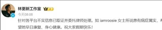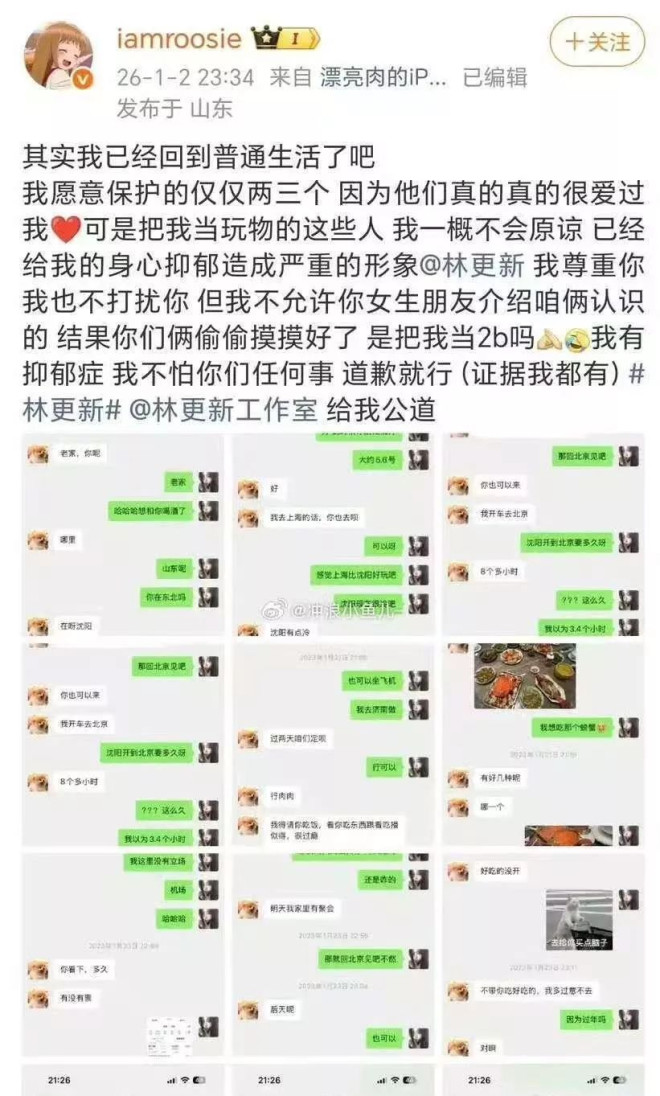 司晓迪的第一枪,开向了林更新。 她说自己想过普通生活,但实在气不过,指控林更新“不尊重人”、“爱玩”,导致她抑郁。