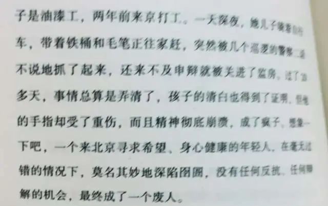 她的儿子在北京打工,深夜回家时被巡逻的警察抓了起来。20多天后,孩子的清白被证明,但他的手指却废了,精神彻底崩溃,成了疯子。