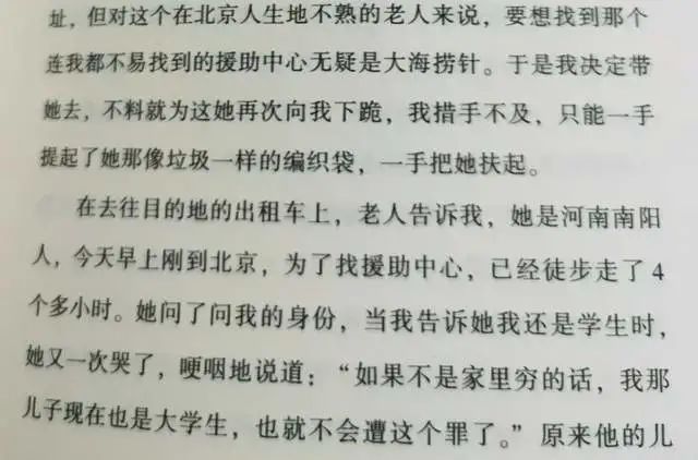 “她问了问我的身份,当我告诉她我还是学生时,她又一次哭了,哽咽地说道:‘如果不是家里穷的话,我那儿子现在也是大学生,也就不会遭这个罪了。’”