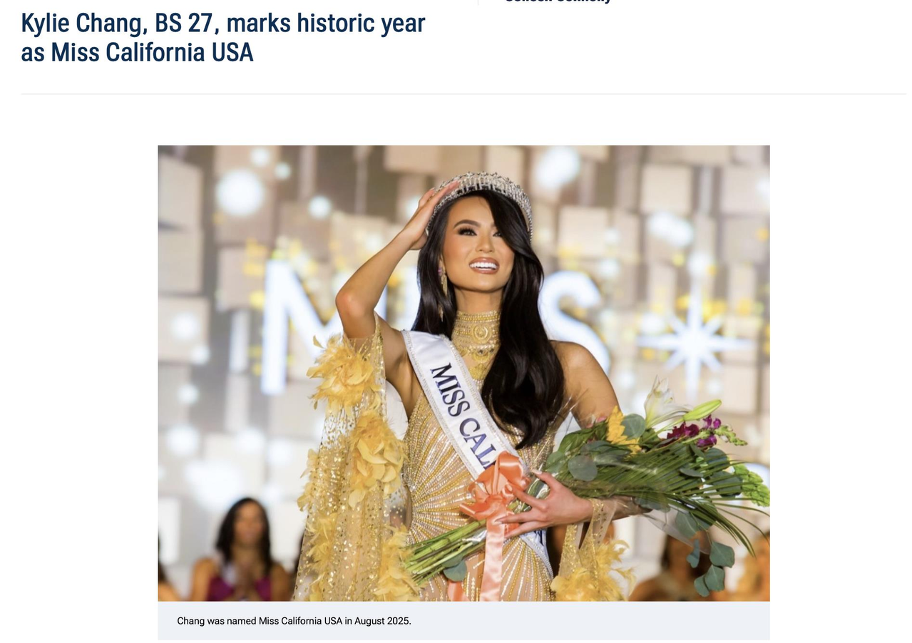 就读柏克莱加大(UC Berkeley)的27岁章以琳(Kylie Chang),荣获2025年加州小姐(Miss California USA)后冠,成为该赛事史上首位夺冠的亚裔女性,并创下首次有两名亚裔同时晋级决赛的历史纪录(另一人是Kayla Jane Usison)。章以琳在选美结束后重返校园,日前接受柏克莱加大的专访。