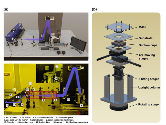 研究团队使用有限差分时域,分析模拟了间隙大小及间隙填充介质对干涉条纹的作用,选用折射率匹配材料对间隙进行填充,抑制掩膜与基底间隙造成的干涉条纹质量下降。同时,研究团队构建了基于显微成像技术的亚微米级精度对准观察平台,使用掩膜板上的双区域周期性条纹标记,实现掩膜与基底顶点的对准,成功实现了分步光刻套刻对准,避免了不同线栅区域的串扰。