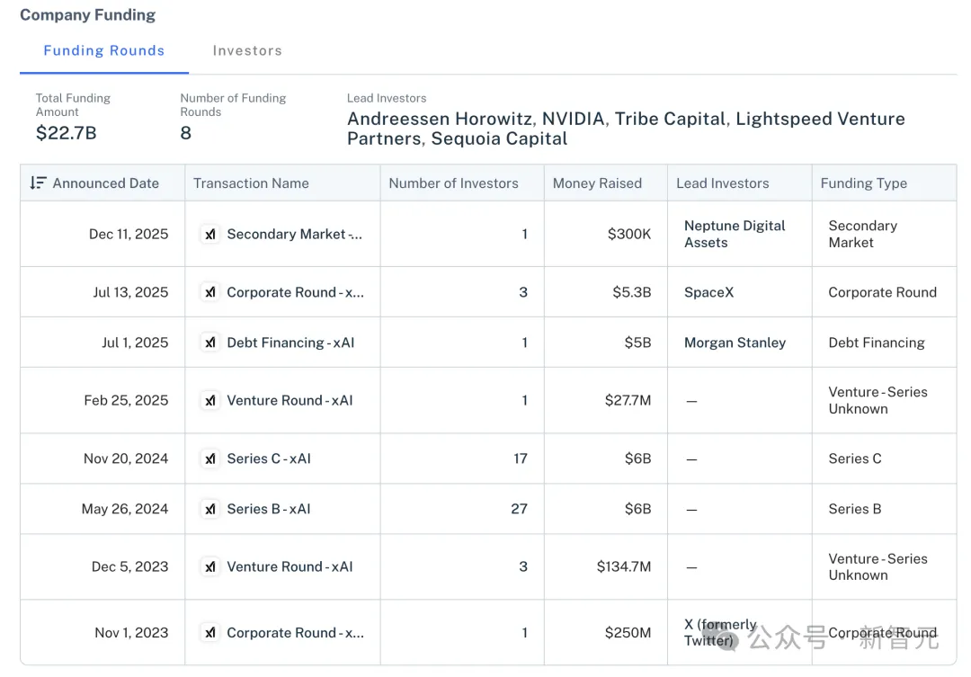 据Crunchbase统计,目前xAI已完成了8轮融资,金额高达227亿美元。