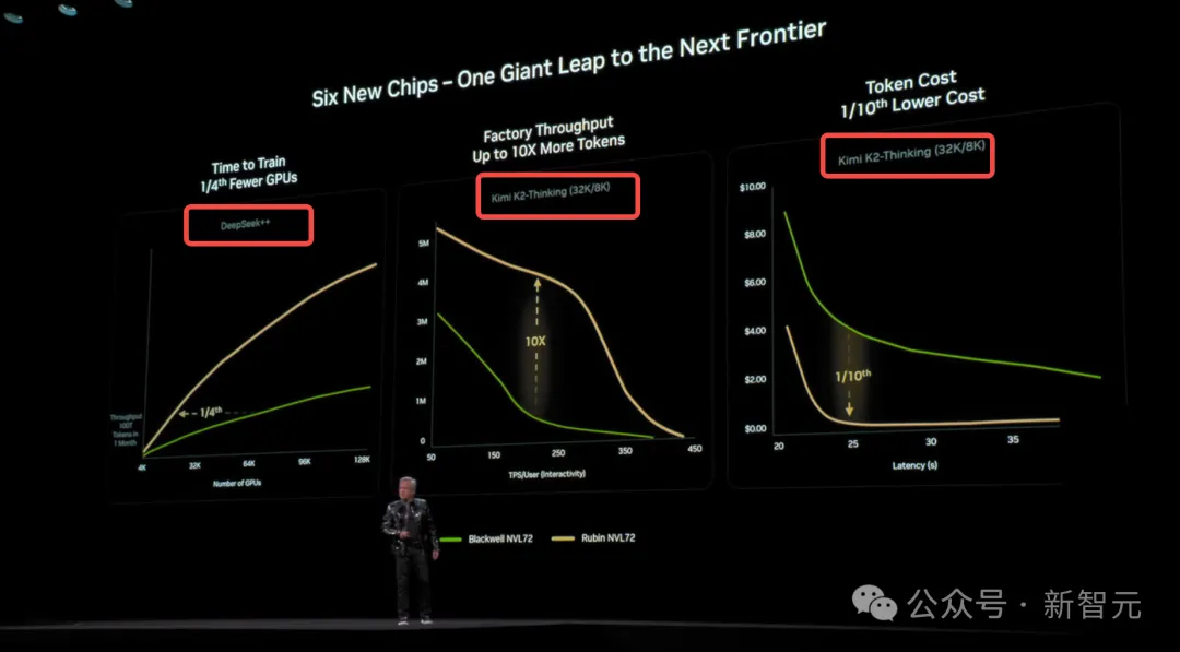 在下一代Rubin架构亮相的核心环节上,老黄还选用了DeepSeek和Kimi K2 Thinking来秀性能。