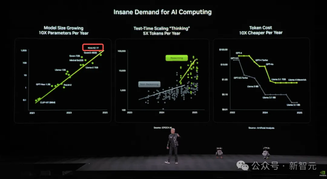 另外,在计算需求暴涨这页PPT上,480B的Qwen3和1TB的Kimi K2成为代表性模型,验证了参数规模每年以十倍量级scaling。