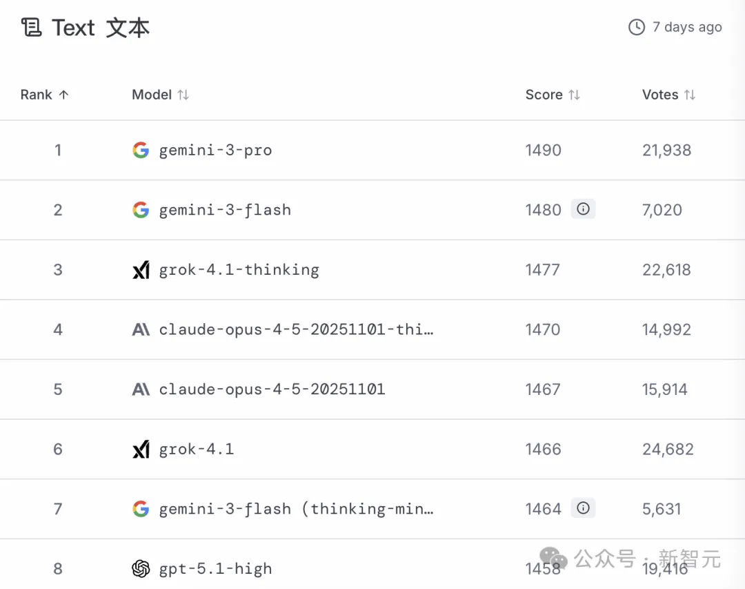 7天前的总分榜单,Gemini-3-pro稳居榜首