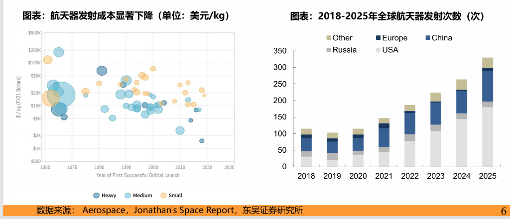 东吴证券表示,商业航天的快速崛起,核心动力在于运载成本的指数级下降。可回收火箭技术的成熟彻底打破了进入太空的经济壁垒,SpaceX猎鹰9号的发射成本已降至约1400-1800美元/公斤,远低于传统航天发射。成本红利推动全球航天发射活动进入“指数级”增长周期,2025年全球航天器发射次数预计超300次,较2021年实现翻倍。