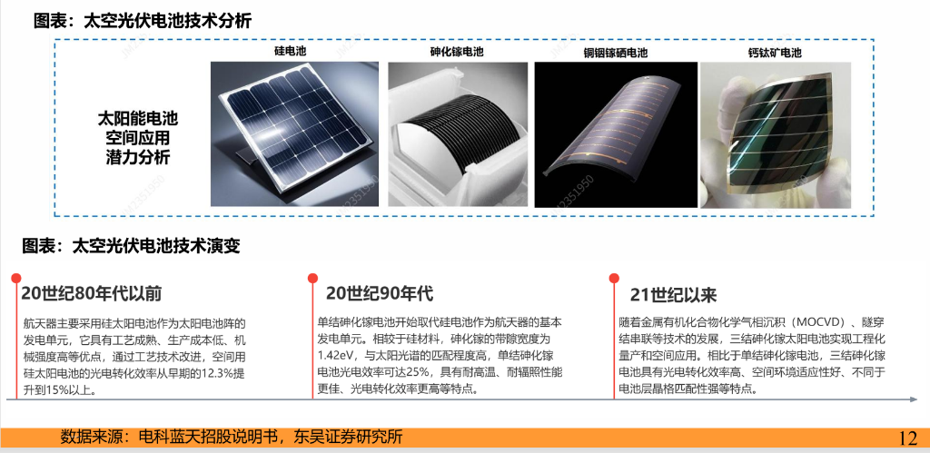 钙钛矿及叠层技术: 未来的潜在颠覆者。钙钛矿具有极高的能质比(可达30W/g)、轻量化以及低成本制造潜力。虽然目前在太空极端环境下的稳定性仍需验证,但其与晶硅结合的叠层技术有望突破效率瓶颈,成为太空供电的更优方案。
