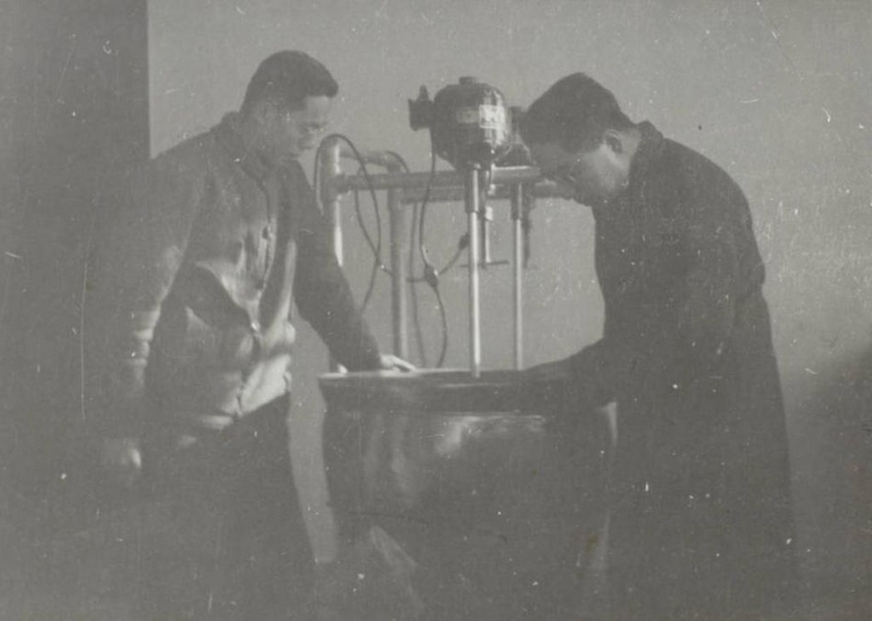 图片说明:马誉澂(左)和童村正在做青霉素提炼工艺的试验(约1947年秋冬)