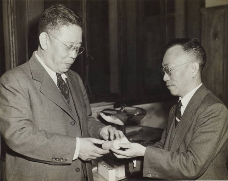 图片说明:汤飞凡向国民政府卫生部长刘瑞恒介绍国产青霉素产品(天坛中央防疫处)