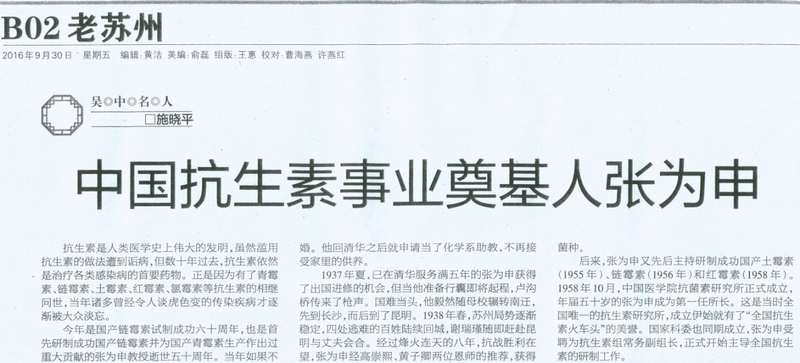 2016年9月30日,《苏州日报》B02版刊登“中国抗生素事业奠基人张为申”一文(作者:施晓平),称:“当年如果不是张为申及时找到了青霉素主要进口原料(玉米浆和乳糖)的廉价替代方法,我国的青霉素投产不知道要晚多少年,价格下降到普通百姓能承受的地步也不知要到什么时候。凭着张为申当年举足轻重的地位和巨大贡献,他被公认为‘中国抗生素事业奠基人’。”又称:“(张为申)先后完成了用棉籽饼粉代替玉米浆、用玉米粉代替乳糖的研究,由此奠定了具有中国特色的青霉素发酵工业的基础,他也因此闻名于国际学术界。上海第三制药厂1953年投产青霉素时,正是用了他的研究成果和他带回来的新青霉素菌种。”