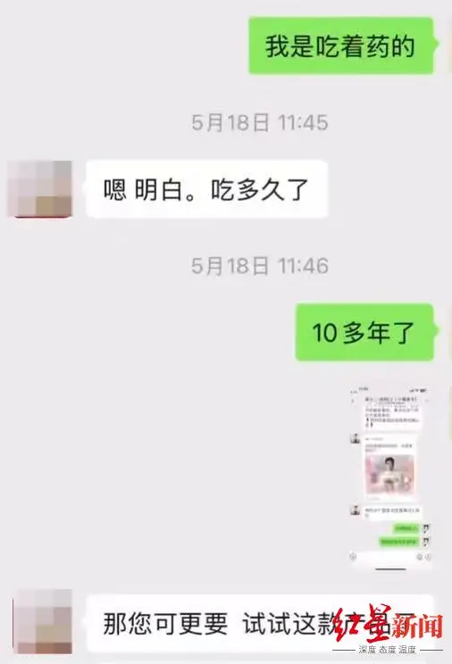 一段切片视频显示,吴某某曾与一男子对谈,两人提及三高三个月就能断药,吴称,“像我这种两年多的,就是六七天就断了。”2025年5月18日,母亲开始预约一周后的某发酵套装直播,这场直播被设置在了微信小程序,需要向客服预约观看。她主动询问客服:“我血压高,怎么购买产品?”