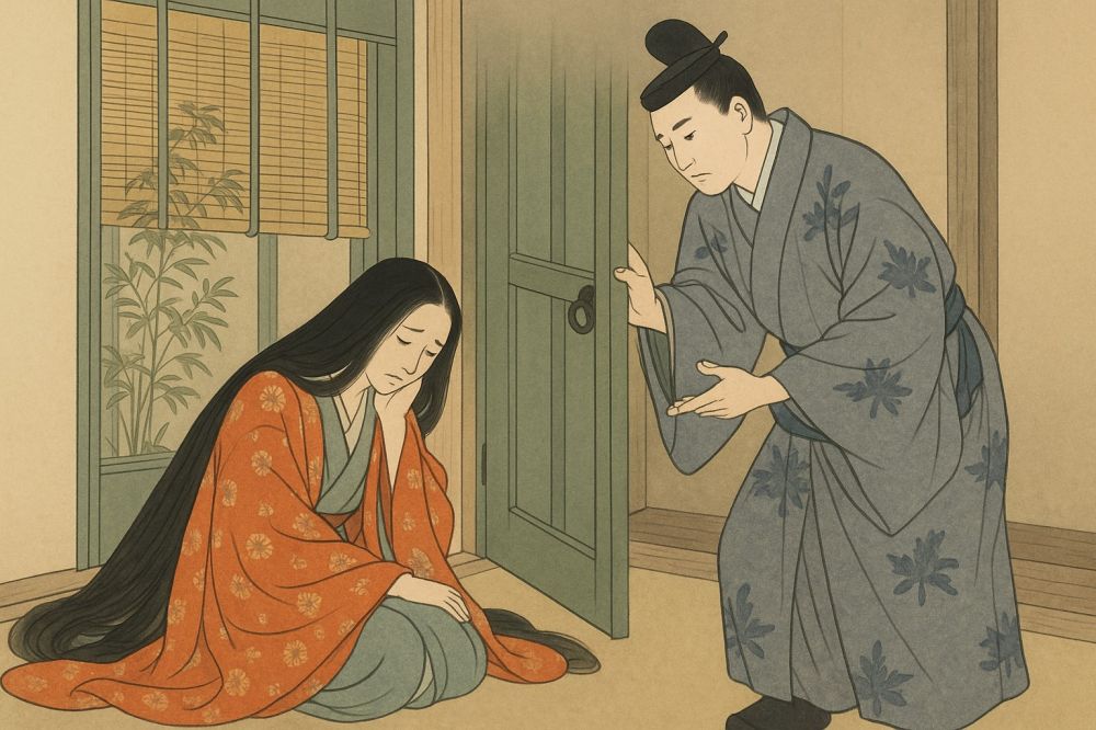 夕雾以前来访,从来不曾如此长留,也不曾显露轻薄之相。今夜这般模样,落叶公主觉得很可担忧。然而轻率地逃往老夫人那边,又觉得不成样子,只得默默无声地坐着。夕雾趁着侍女膝行入内传言时,就跟了进去。侍女回头看见夕雾进来,吃了一惊。公主困窘不堪,连忙膝行而去,闯出了北面的纸隔扇。夕雾敏捷地赶上,把她拉住。公主的身体已经进入邻室,但衣裾还留在这边。纸隔扇半开半闭,吓得身上冷汗像水一般流出。众侍女哭丧着脸叫道:“哎呀!这算什么样子呢?想不到这位大人会起这种念头啊!”夕雾答道:“我但求如此接近公主而已,你们何必大惊小怪呢?我虽微不足道,但多年以来的诚意,你们总该早就知道了吧。”他就不慌不忙地诉说他的心事。但公主哪里要听!她只觉得遭此奇耻大辱,心中万分委屈,一句答话也说不出来。