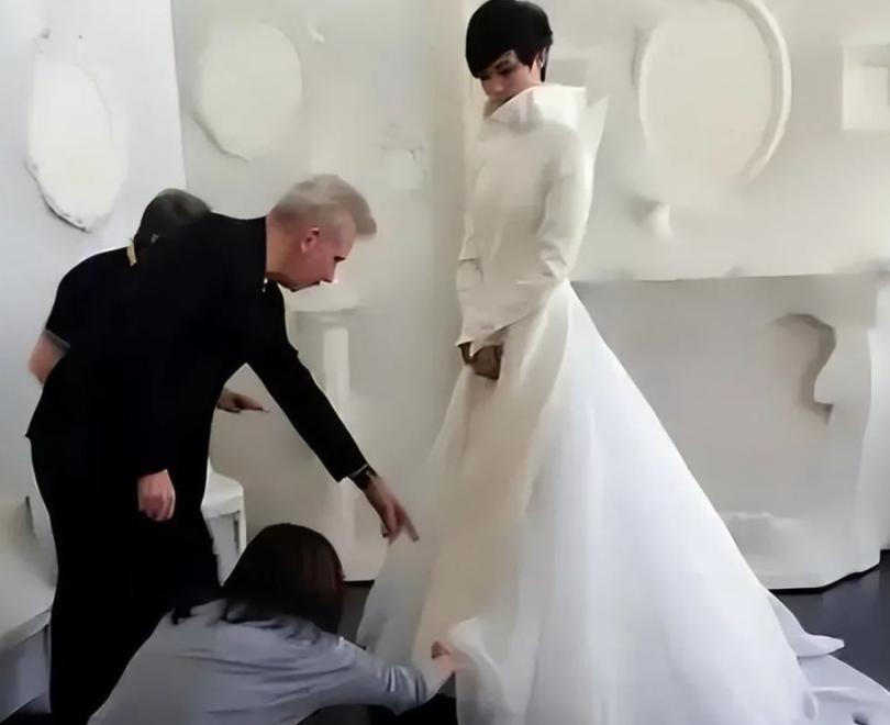 当时地面湿滑,她穿着十厘米高跟鞋行走不便,主办方便安排了一位外籍工作人员搀扶。