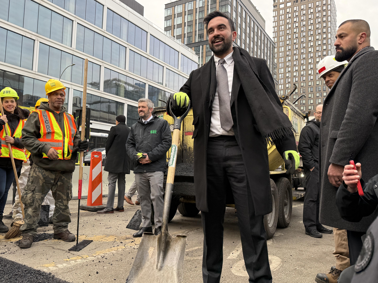 该路段位于地兰西街(Delancey St.)的曼哈顿端桥头,因坡度突降形成明显路面突起,被指过去导致多起骑行者失控摔倒事故。曼达尼当天与市交通局(DOT)局长佛林(Mike Flynn)一同到场,并在媒体镜头前尝试铲起沥青铺设路面。