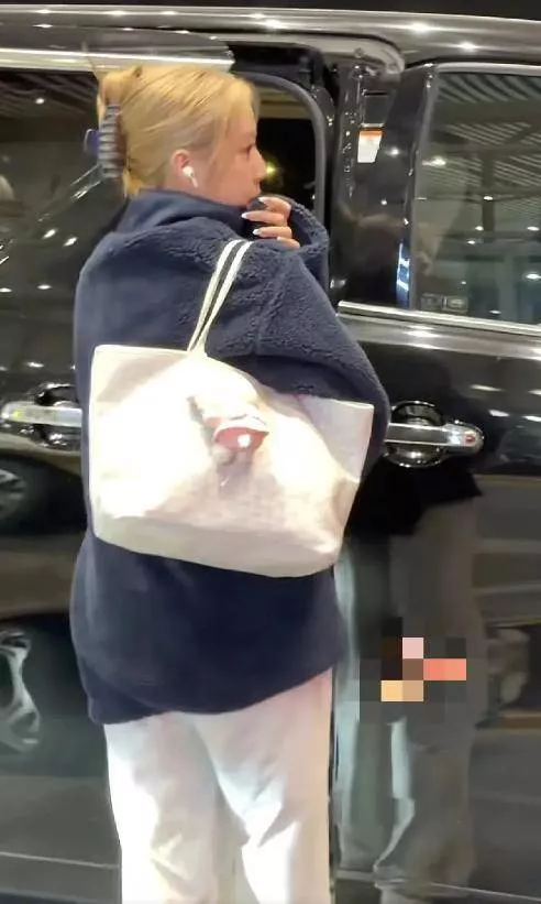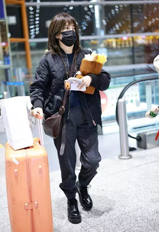 为了不被认出来,她甚至把那双标志性的大眼睛都藏在了帽檐和口罩的阴影里,只有手里抱着的一个路人送的毛绒玩具,透着几分温情。她似乎只想做一个安静的赶路人,将自己隐没在人群中。