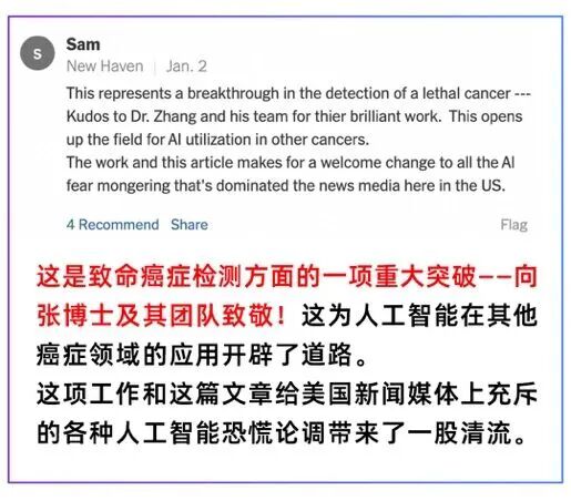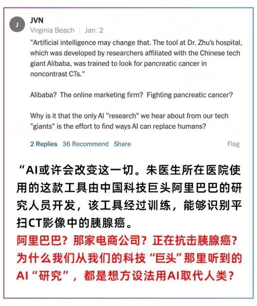 话说回来,之所以炸出一大群美国公知反思怪,起因是《纽约时报》前几天报道了一条新闻,大意是中国科技公司阿里巴巴开发的医疗AI应用在平扫CT影像识别领域,在发病极早期预警了一些胰腺癌的病例,挽救了患者生命。