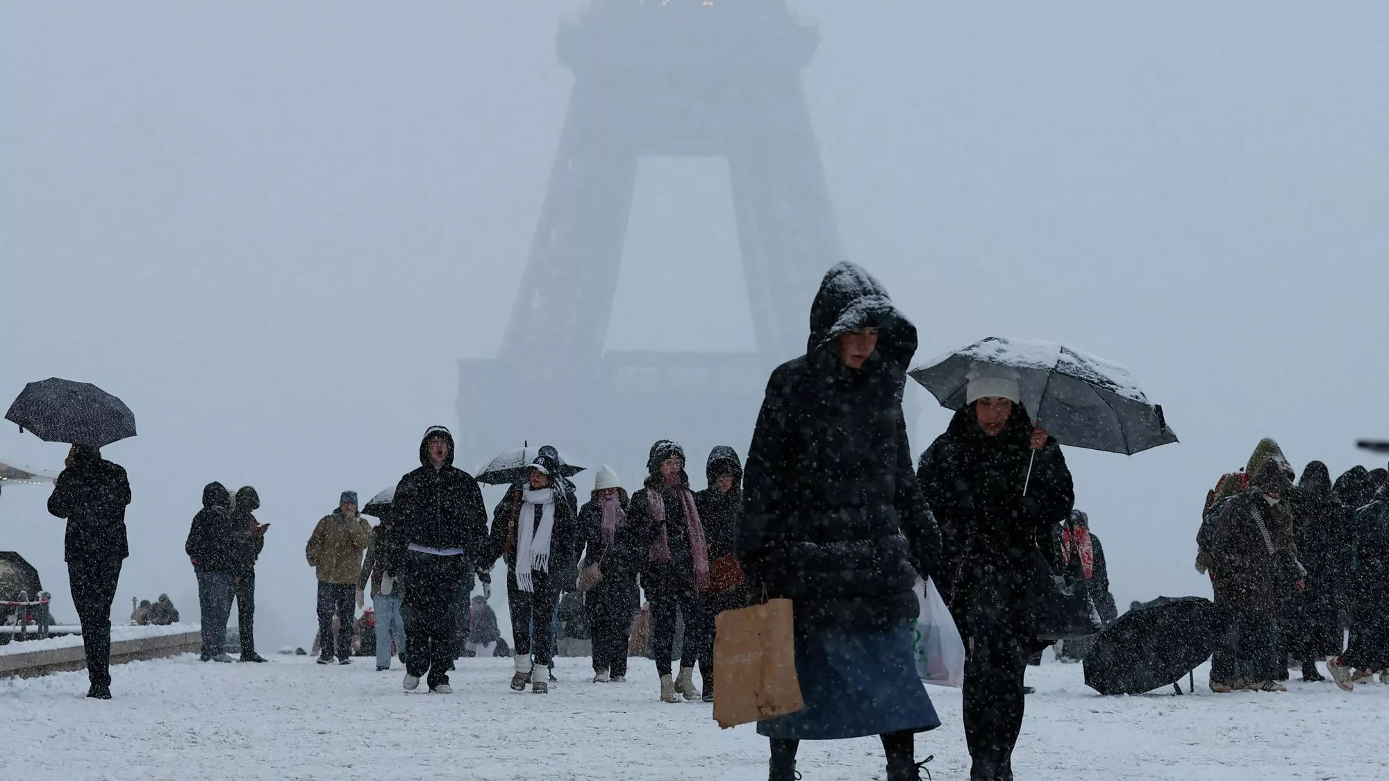 2026年1月5日,法国巴黎,人们在白雪皑皑的特罗卡德罗广场(Place du Trocadero)漫步,其中可见位处附近的艾菲尔铁塔(Eiffel Tower)。(Reuters)