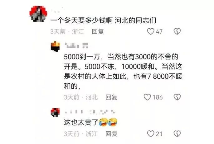 有河北网民指,每年取暖费从5000到一万,支出少一些的是“不舍得开(暖气)”。