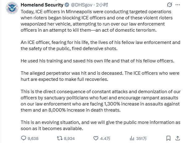 国土安全部助理部长特里西娅·麦克劳克林(Tricia McLaughlin)在一份声明中表示,ICE特工当时正在执行针对性行动,一群“暴乱者”阻挡执法人员,其中一人“将车辆武器化”,试图驾车撞击特工“意图杀死他们”。