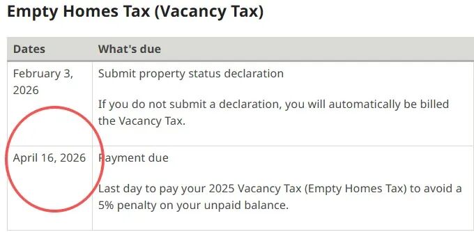 在温哥华有房的朋友注意, 温哥华市府已经开放2025 年度房屋空置税 (Empty Homes Tax) 的申报,截止日期为 2026 年 2 月 3 日。
