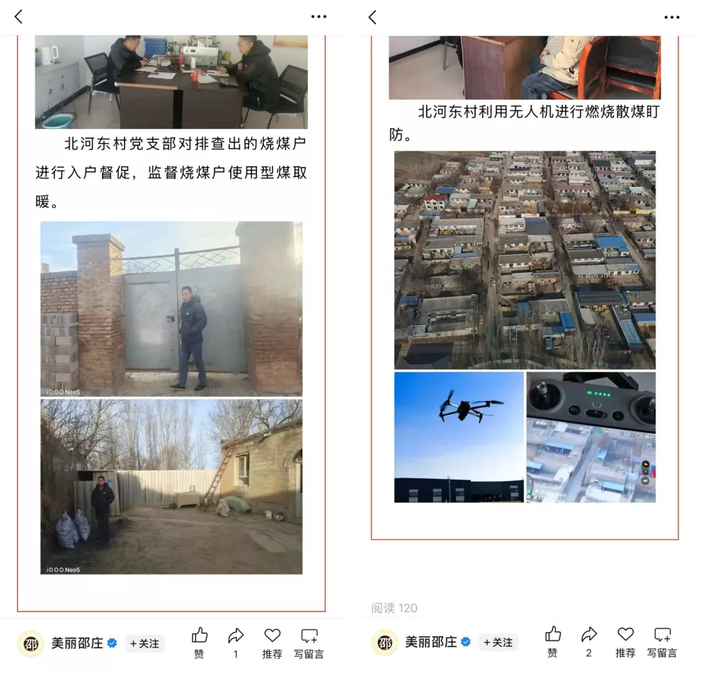 而邯郸市北河东村用无人机盯防,还会夜访烧煤户。