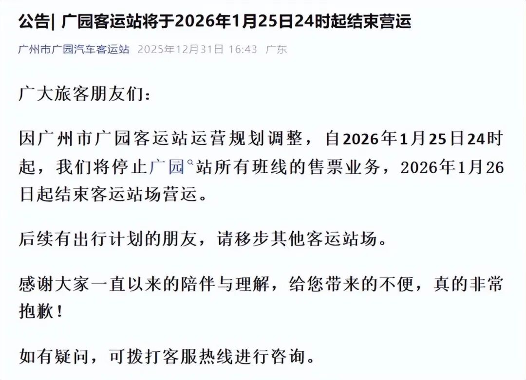 2026年1月25日24时,广州市广园客运站将正式结束营运。