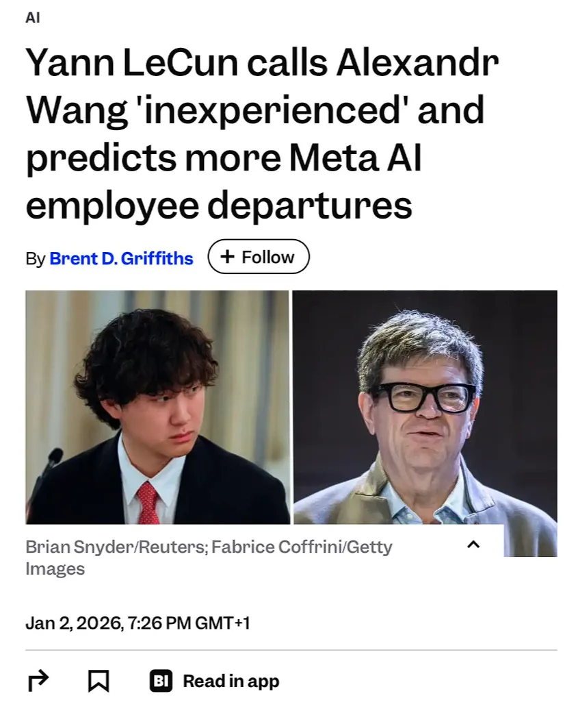 65 岁的 Yann LeCun(杨立昆)离职 Meta 创业还没一个月,就炮轰起了他的老东家,和那位他看不起的小将 Alexandr Wang。