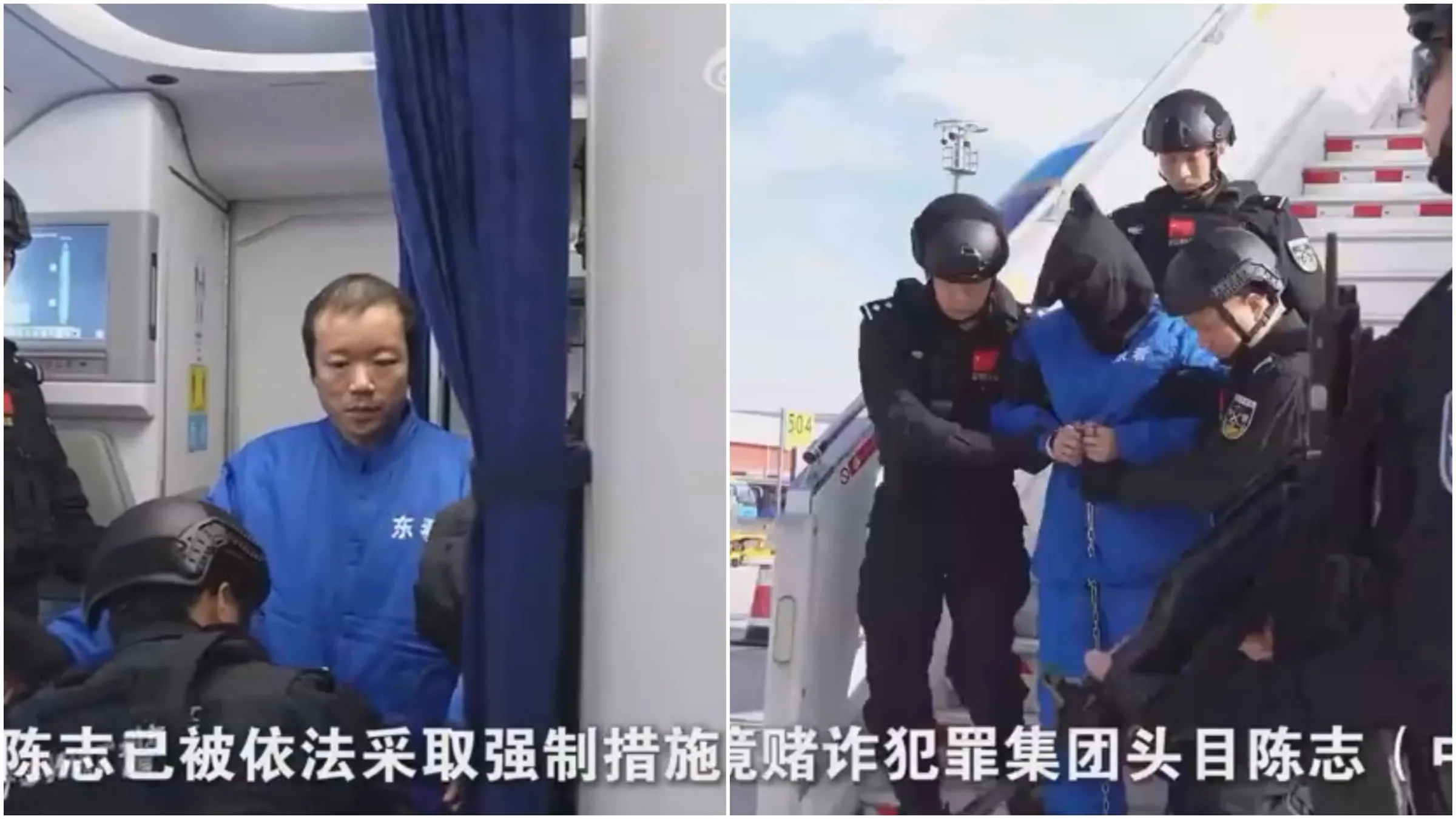 《环球时报》稍早释出一段影片,就是中国公安前往柬埔寨,在重装警力戒护下将陈志押上专机,铐上手铐与脚镣,遣送回中国接受审判。