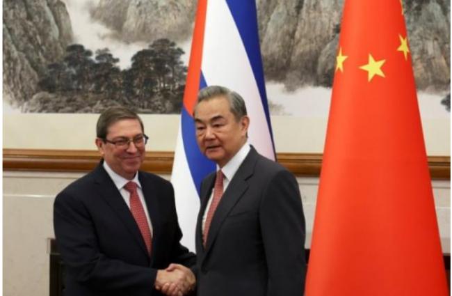 5月12日,古巴外长布鲁诺・罗德里格斯・帕里利亚(左)与中国外交部长王毅在中国北京钓鱼台国宾馆举行会谈前握手。/韩国盖蒂图片社