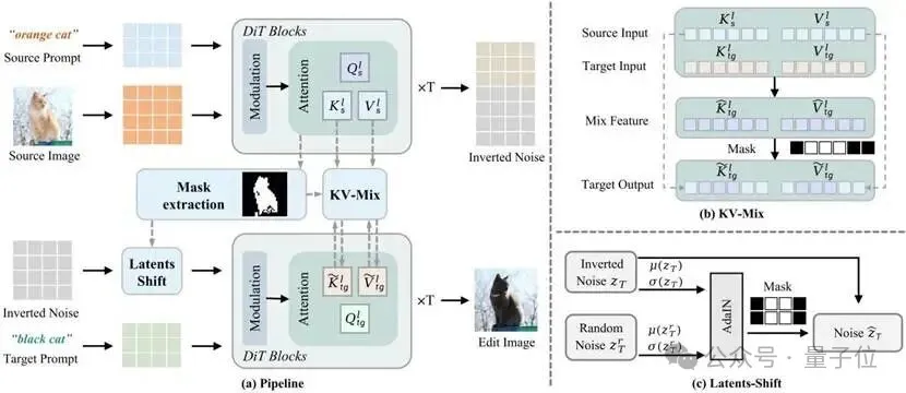 编辑区:将原图与目标的K(Key)和V(Value)注意力特征按比例混合。这种“混合”机制让模型既能按照编辑指令(Prompt)进行编辑,又能参考原图的结构,实现平滑过渡。