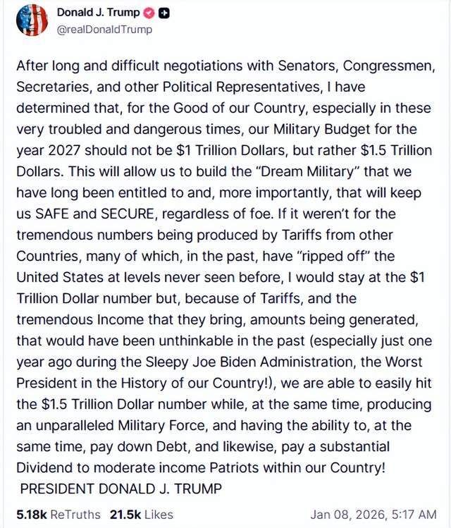 美国时间1月8日5点17分,川普洋洋洒洒发布了一篇长文贴,在贴文中川普说:“经过漫长而艰难的谈判,与参议员、众议员、部长们以及其他代表们进行了谈判,我已经决定,为了我们国家的利益,尤其是在这些非常动荡和危险的时代,我们2027年的军事预算部应该是1万亿美元,而是1.5万亿美元!这将让我们建立我们长期以来应得的“梦幻军队”。”