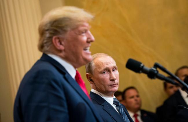 资料图:2018年,美国总统川普在赫尔辛基与俄罗斯总统普京会面。 Doug Mills/The New York Times