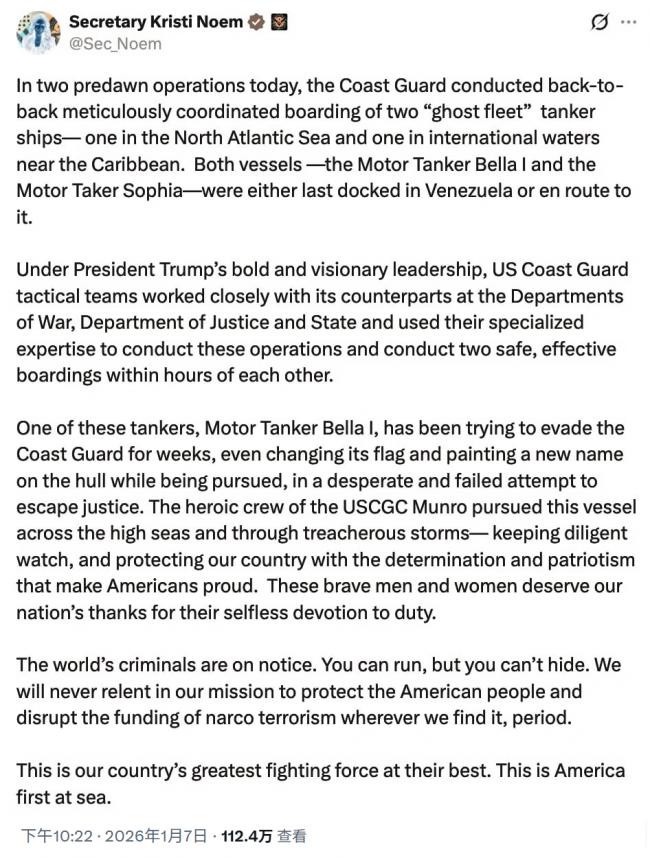 诺姆表示,扣押马里内拉号与另一艘油轮索菲亚号在南美北海岸水域同时发生。她在X的帖子中写道:“全世界的罪犯都已警觉。你可以跑,但你藏不了”。