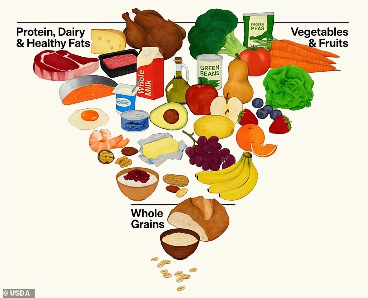 新指南摒弃了过去几十年使用的“我的餐盘”模型,推出了一个“倒置食品金字塔”。在这一模型中,肉类和蔬菜被置于金字塔最主要的位置,全谷物则位于较窄的底部,体现出指南对蛋白质和脂肪的重视程度。指南强调,每顿饭都应包含高质量蛋白质,例如鸡蛋、家禽、海鲜和牛肉等,同时建议每日蛋白质摄入量为每公斤体重的1.2至1.6克,高于过去的标准。
