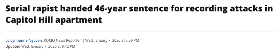 一名在西雅图国会山(Capitol Hill)地区长期实施性侵并偷拍视频的连环强奸犯,本周三(7日)被判处46年以上刑期,几乎将在狱中度过余生。