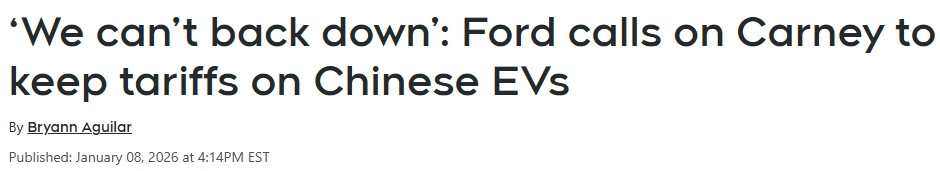 在加拿大总理卡尼计划于下周访问中国之际,安省省长福特周四再次强调,加拿大对中国电动车(EV)征收的关税不应取消。