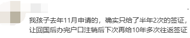 “我孩子去年11月申请的,确实只给了半年2次的签证,让回国后办完户口注销后下次再给10年多次往返签证”