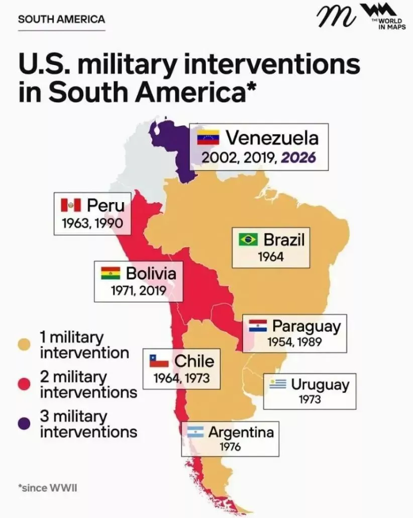 最后,有网民在诺顿的帖文下贴出了一张图片,上面记录了自二战结束以来,美国对拉美多个国家进行的军事干预。