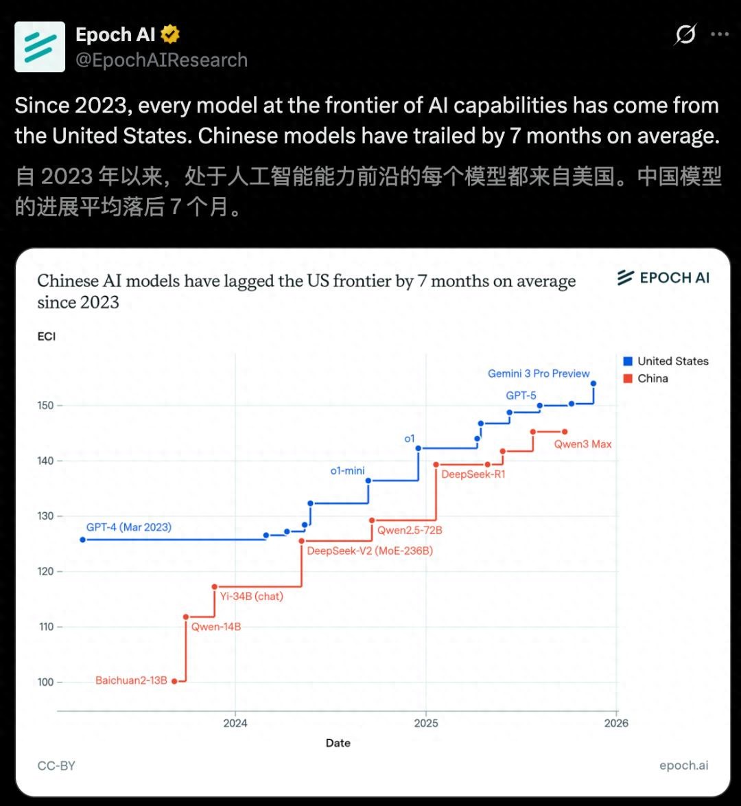 一张来自Epoch AI图表给出了一个冷静却尖锐的结论:中国AI平均落后7个月。