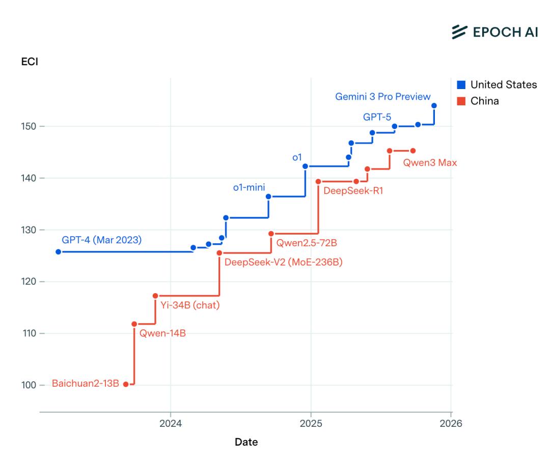 Epoch AI最新图表,依旧衡量的是综合能力指数ECI(模型整体前沿水平)。