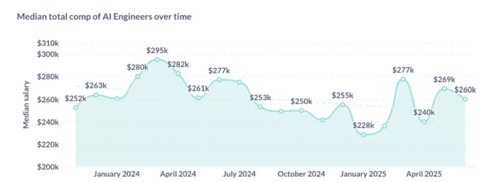 从更长的时间维度看,AI人才的薪酬演变轨迹令人震撼。2014年谷歌收购DeepMind时,AI人才的人均成本约为34.5万美元;2017年,顶尖AI人才年薪达到50万美元;2023年顶级软件工程师薪酬超过70万美元;到了2025年,数亿美元级别的薪酬方案已不再罕见。