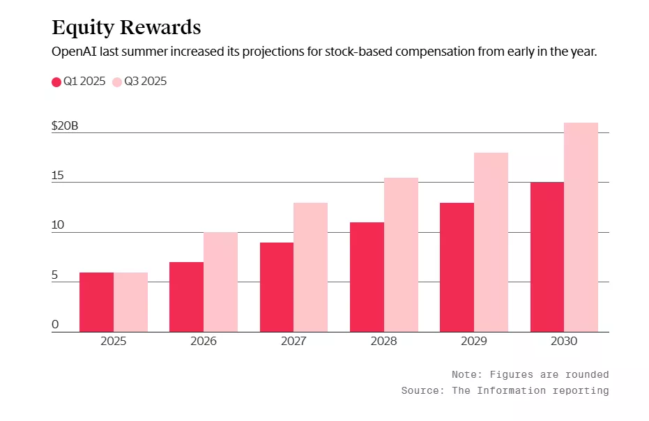 据OpenAI内部预测,从2025年到2030年,该公司的股权激励支出将比原计划增加约200亿美元。2026年基于股权的薪酬约为100亿美元,明年预计130亿美元,到2030年将接近210亿美元。